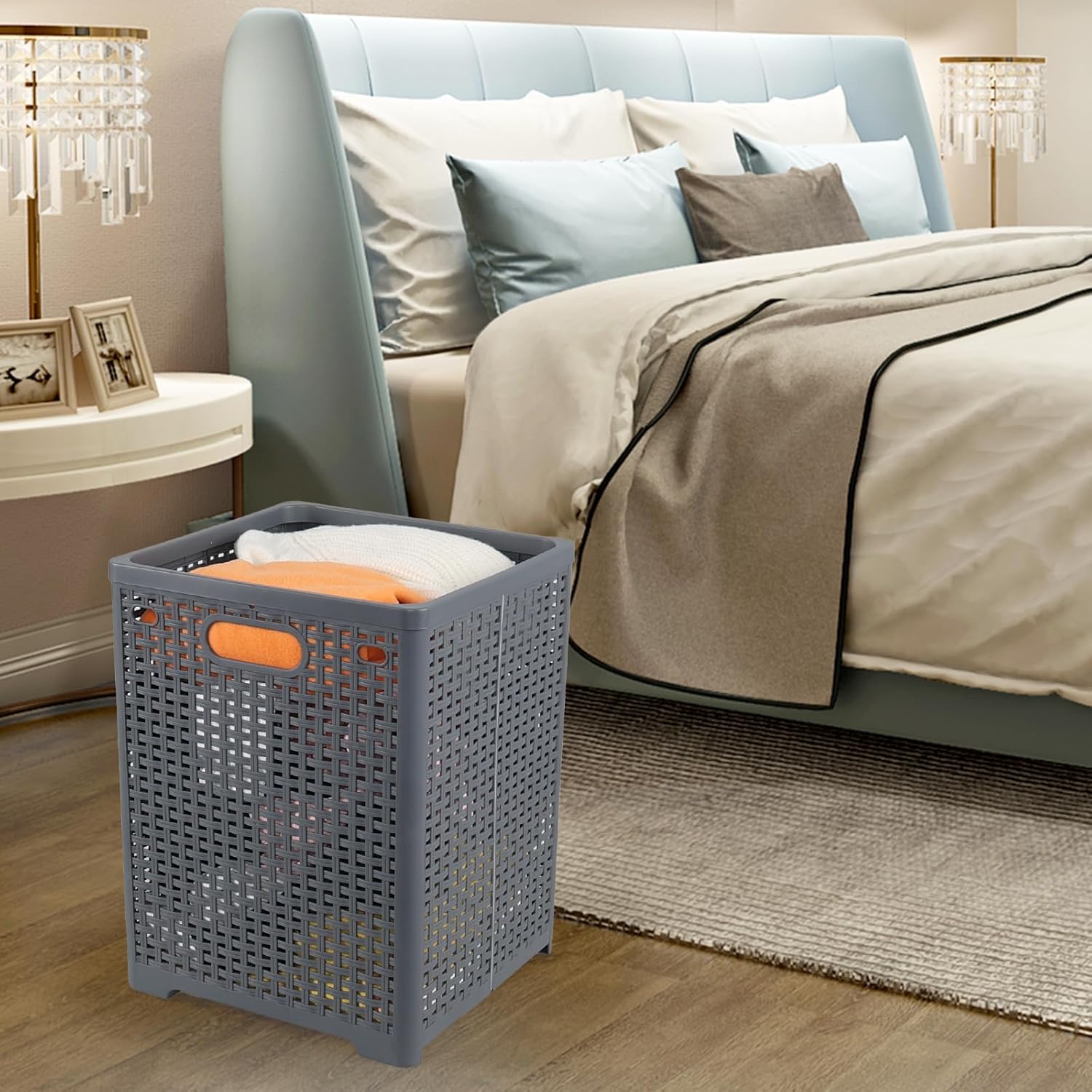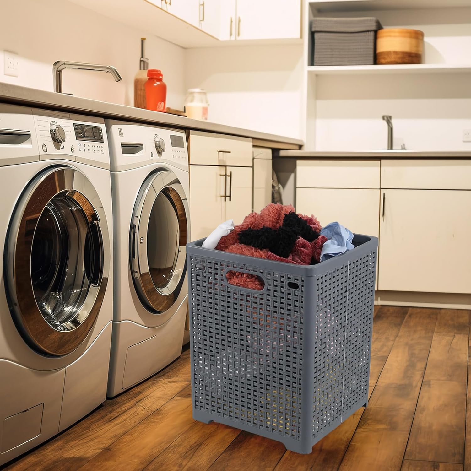 Ionoloy 3 pack 46 L foldable plastic laundry hampers, grey color, unfolded size: 13.43" x 12.76" x 17.72", good workmanship and good breathability.