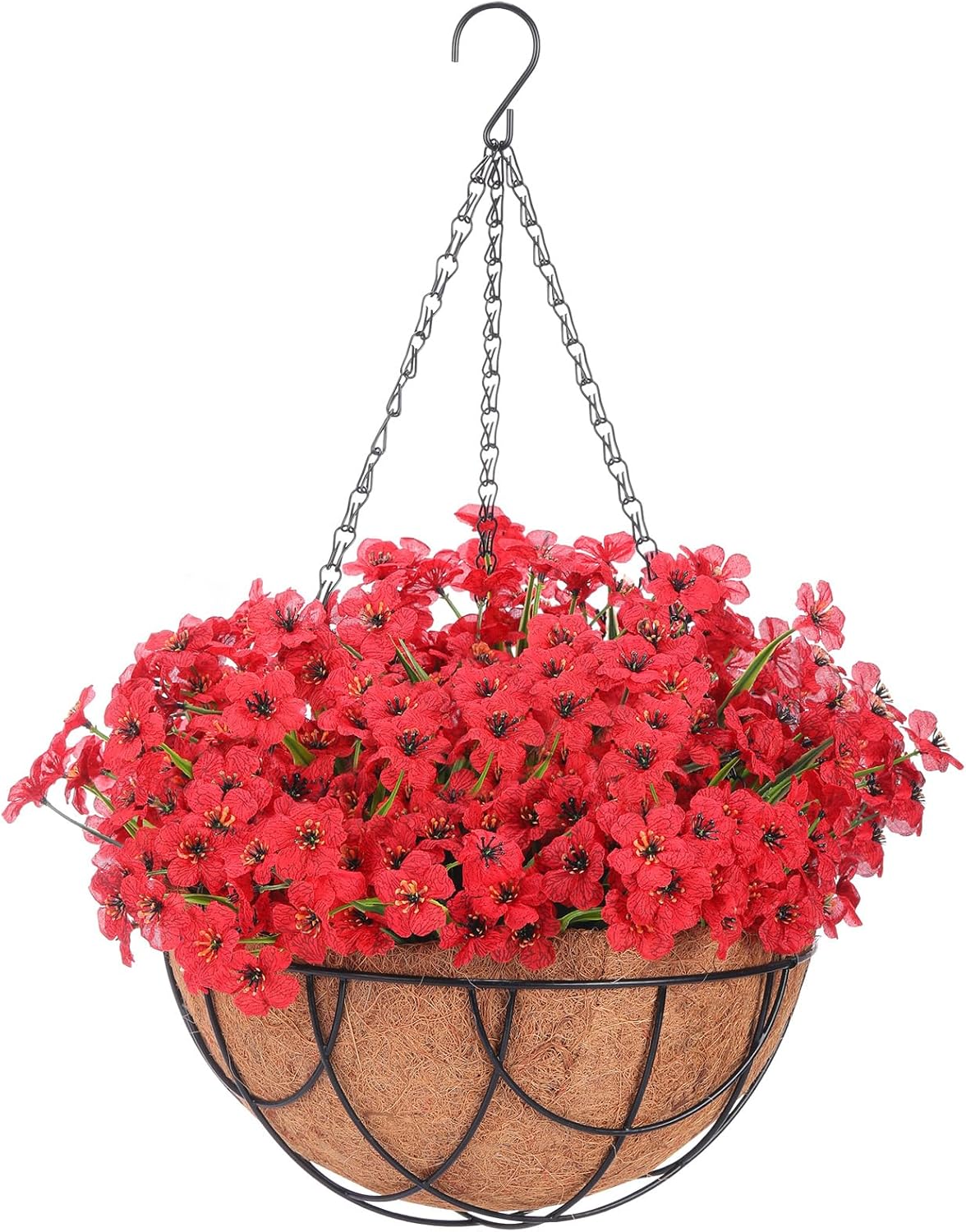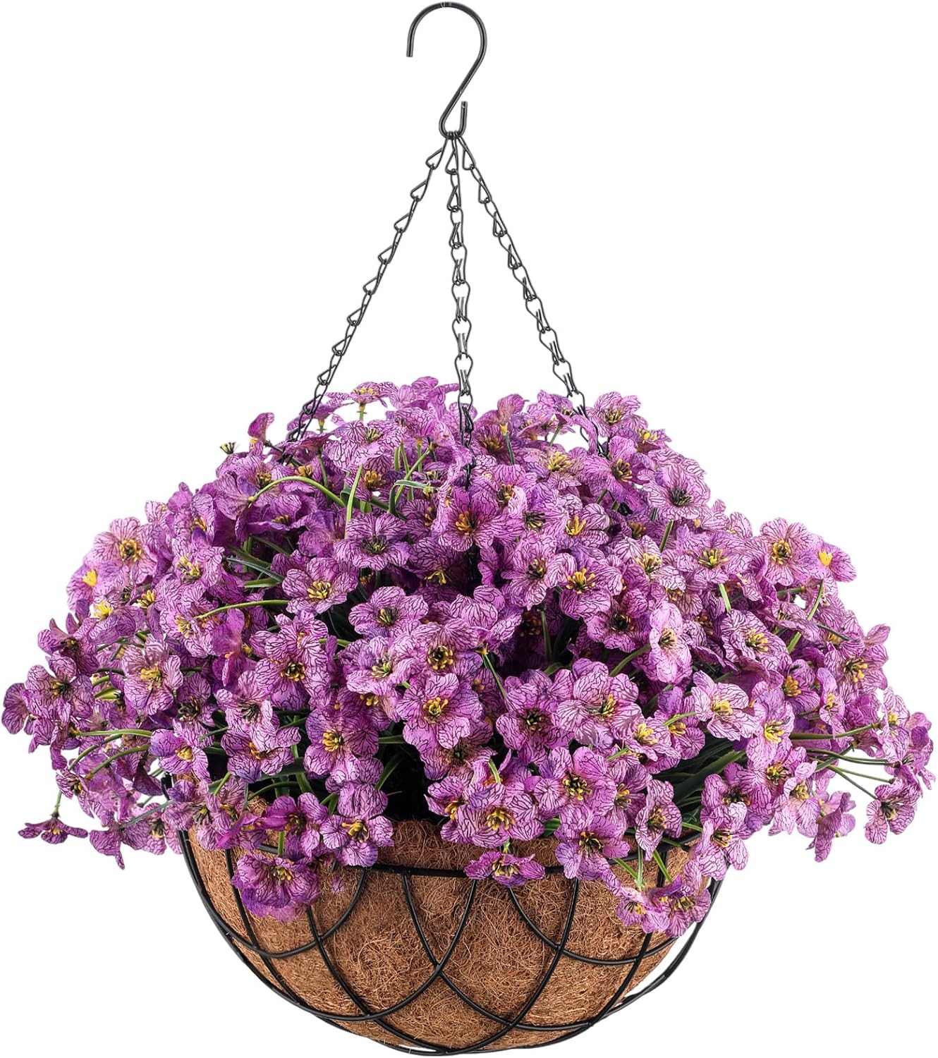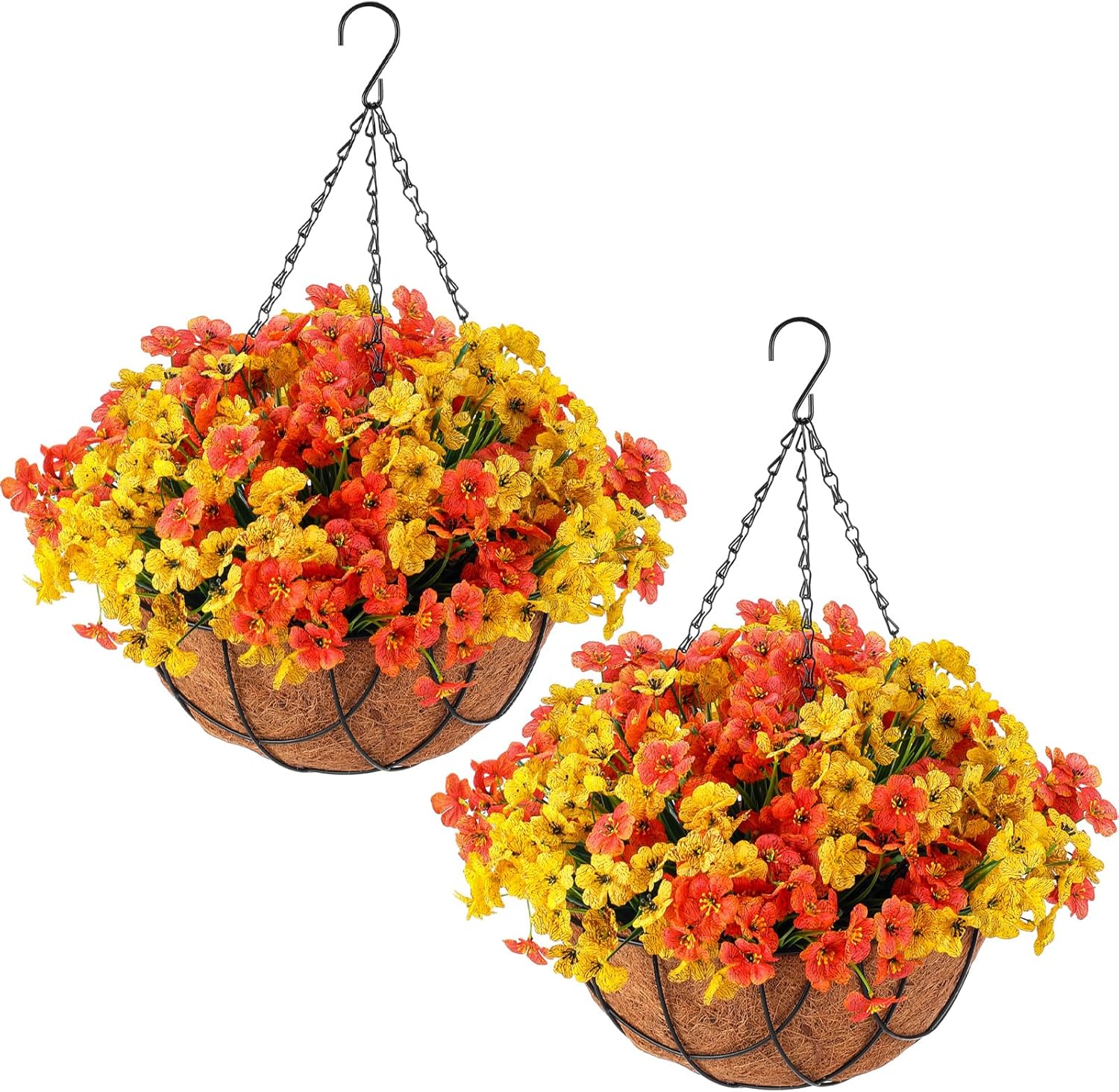 Features: Hanging artificial plant decor: Hanging baskets and artificial flowers are made of quality materials and require no maintenance once assembled. It's UV resistant and sturdy enough for any weather. No need to water. Ideal gift: Artificial flowers in baskets are ideal for gifts and the good display of warmth and care. The desirable gift for family and friends on birthdays, housewarmings and other occasions. With highly simulated leaves, lifelike fake hanging plants will bring vitality and freshness to your living space. No watering or any maintenance is required year round. Specifications: Size: Hanging basket: approx. 12 in in diameter, hanging height 21 in Artificial Milan grass hemisphere: approx. 9 in in diameter Foam hemisphere: approx. 4.7 in in diameter Artificial orchid: approx. 13 in Quantity: 46 Material: Hanging basket: iron frame, coconut Artificial Milan grass hemisphere: plastic Foam hemisphere: foam Artificial orchid: plastic, silk Package Included: 2 x Hanging baskets 2 x Artificial Milan grass hemispheres 2 x Foam hemispheres 40 x Artificial orchids Note: Manual measurement, please allow slight errors on size. Squeezing may occur due to transportation. If the artificial plants are deformed, you can use a hair dryer to restore them to their original shape. If the flowers fall off, just put them back on the branches. The artificial flower hanging basket is delivered in an unassembled state. Please see the product picture for assembly steps.