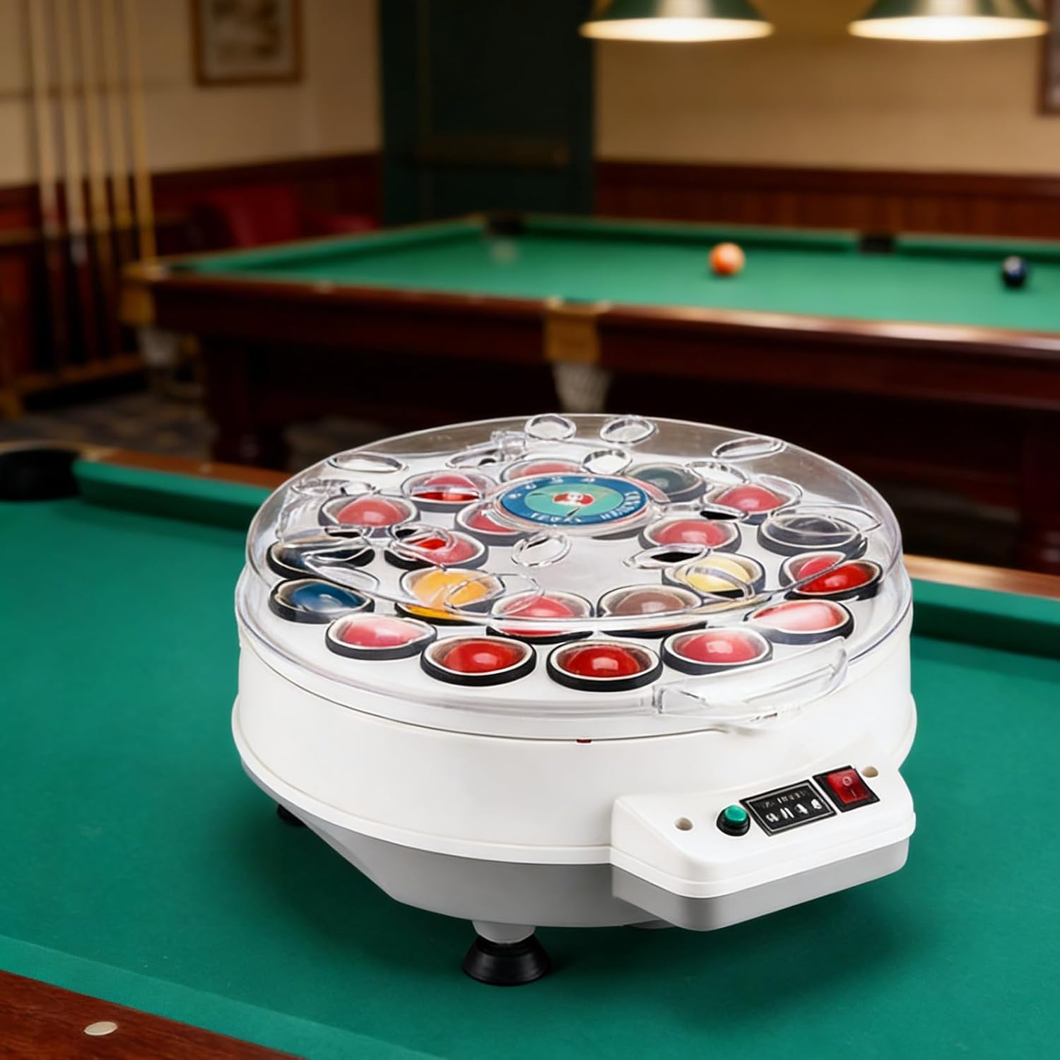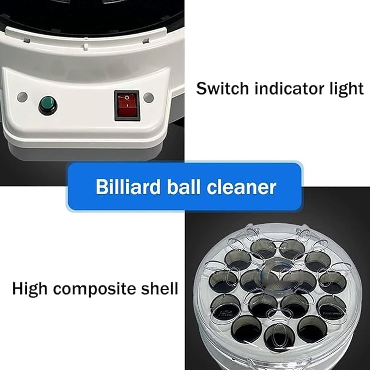 The machine adopts a solid square four-corner base, paired with shock-absorbent support feet to keep stable and steady during operation. The transparent box cover allows users to observe the whole cleaning process clearly, helping to ensure thorough cleaning of each ball. The interior uses pure wool loops and matching wool felt for gentle and effective surface cleaning; these wool components are reusable for long-term daily use, and cannot be laundered with water.Built with a high-efficiency motor and a dedicated motor cooling system, the device supports fast heat dissipation during continuous working, which helps protect internal parts and improve overall service life. The main body is constructed with durable ABS and PC materials, featuring good structural stability and long service life.Suitable for a variety of scenarios including private billiard rooms, commercial billiard clubs, billiard training spaces and entertainment venues, this machine works with wide voltage compatibility of 110V/220V to adapt to different power environmentsBefore use, place the billiard balls into the machine properly, apply an appropriate amount of dedicated cleaning liquid evenly, then power on and press the start button to activate automatic cleaning. Do not power on the machine without placing balls inside, and use the cleaning liquid in moderate amounts for safe and normal operation