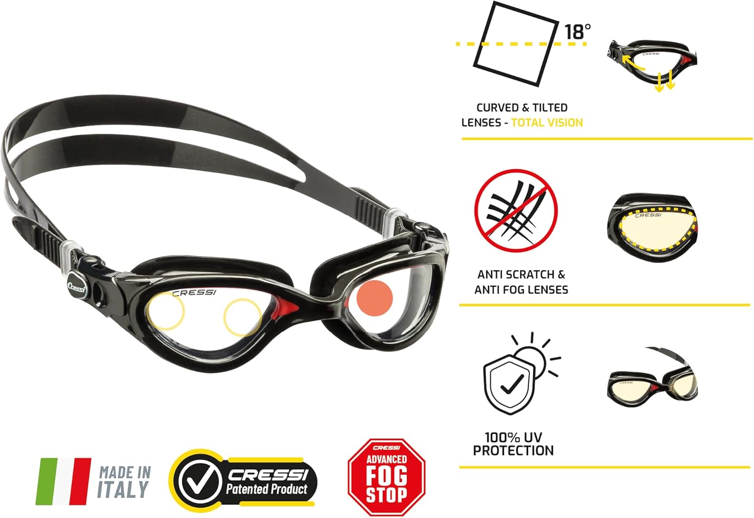 Swimming goggles with separate lenses that fit perfectly on many face shapes thanks to an elastic element inside the structure. Lenses are slightly curved at the outer edge to provide maximum visibility. Shatterproof lenses with scratch protection, UV protection and anti-fog coating on the inside. Indestructible buckles with micrometric adjustment. The buckle-strap combination can be quickly replaced with other models from the Cressi range.