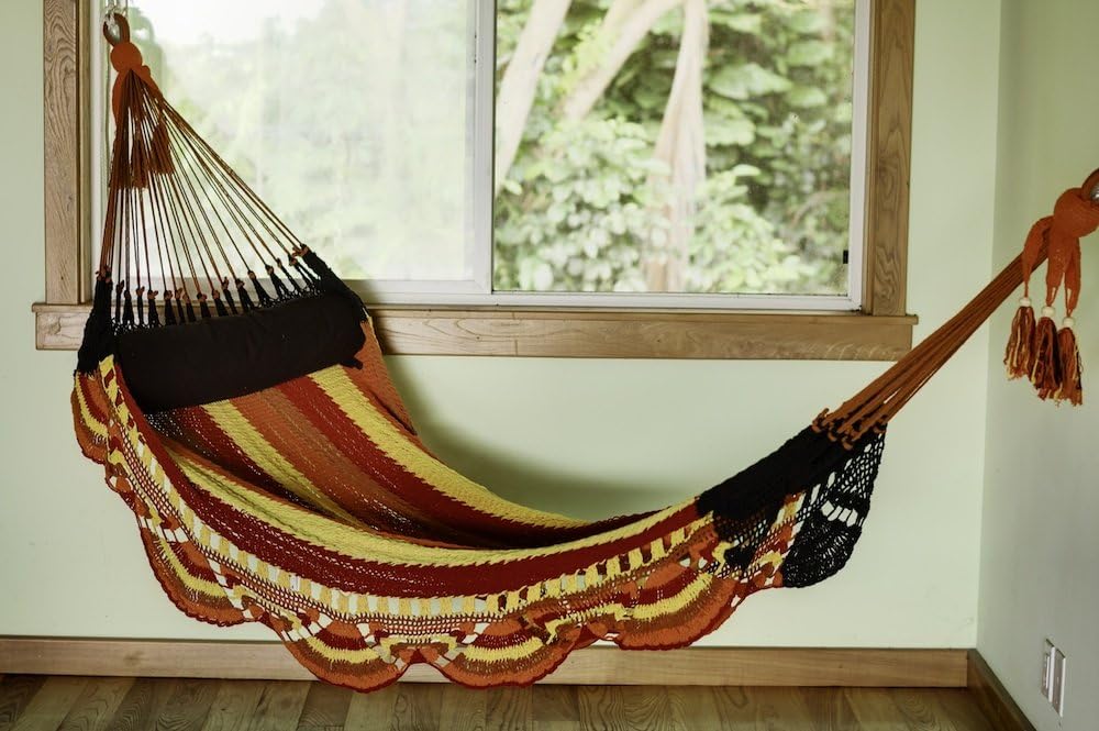 The El Bandido hammock from Lazy Bandido is the perfect hammock for bold, lazy rebels who want to relax indoors, outdoors, or in their vacationing bosses office. The hammock is hand-woven by skilled artisans in Masaya, Nicaragua using a double weave technique for ultimate comfort and durability while allowing hammock to stretch and conform to your individual body shape. The hammock supports 400 pounds and the bed portion measures 7 feet long by 4 feet wide. Large enough to fit any adult, some small couples, and certain small horse breeds. The hammock ends hang about 10 feet apart and require a minimum hanging space of 10 to 12 feet for comfortable use. Includes 1 hammock. Spreader pillow and hanging kit not included. The El Bandido hammock features a deep red, yellow, orange, tan, and black stripe pattern. 1-year warranty with 100% refund for any reason.