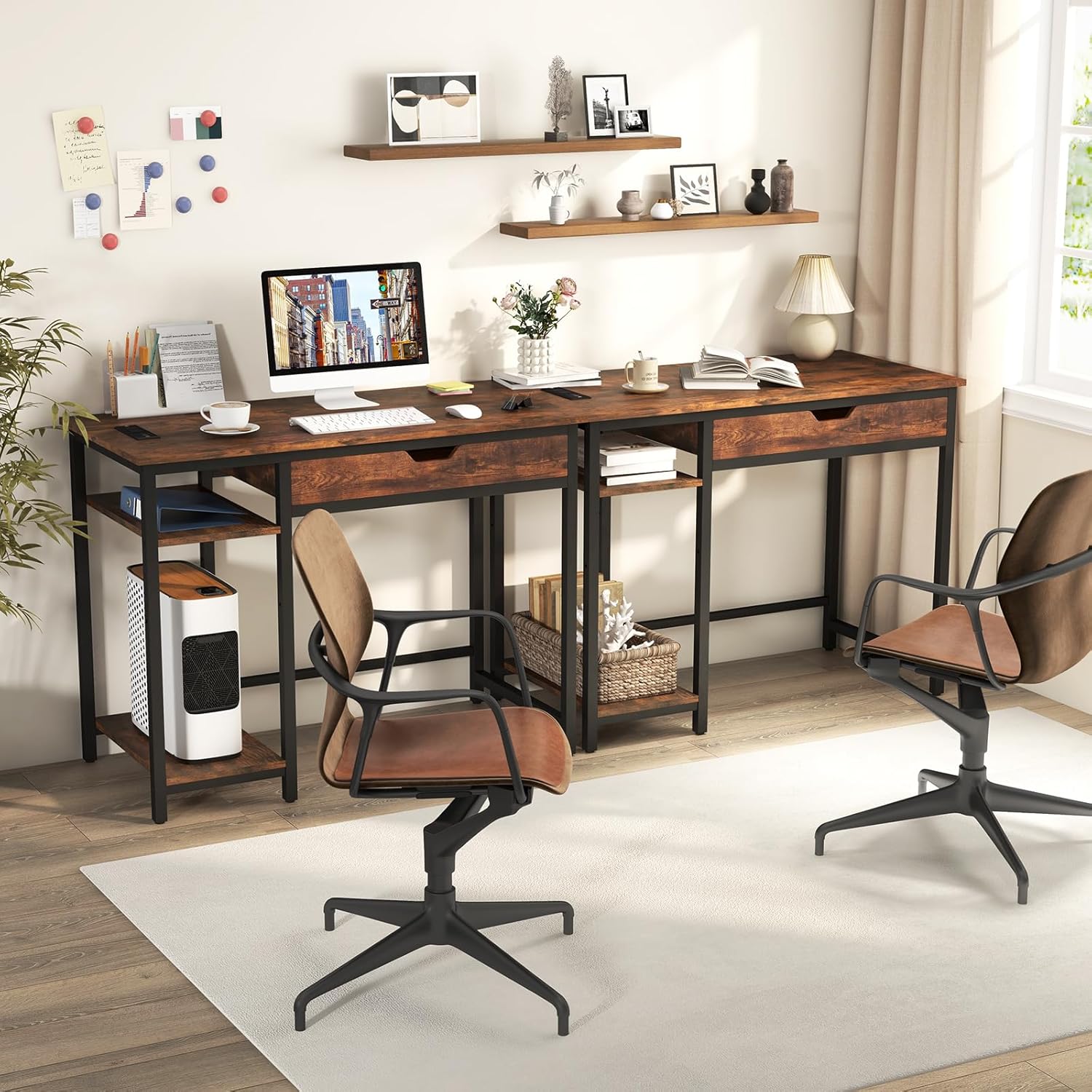 Description: This industrial computer desk is a great addition to your living space. With built in power outlets, you can conveniently charge your phone, tablet or power bank. Its enriched storage space can keep everything organized without any mess. Spacious desktop and large drawer design help store your computer, laptop, mouse, favorite books, or notes for easy access. Adjustable and removable middle shelf allows you to customize the shelf space as you need. Also, 2 side hooks can hang headphones or bags. Constructed of anti-wear board and sturdy metal frame, this computer desk with drawer is built to last. More well-made details include the cut-out handle, smooth sliding rails, easy-to-clean surface. Compact size makes it fit well in your home office, study room, bedroom, or living room.Features: Built-in power station to easily charge several devices at one time Ample storage space with large desktop, drawer and 2-tier shelf Includes 2 side hooks for hanging headphones, backpack, bags, etc. Adjustable and removable shelf holds items of different sizes Sturdy metal frame and thickened board for high durability Adjustable foot pads add overall stability and protect the floor Easy to open the drawer with cut-out handle & smooth slide rails 5ft long power cord ensures convenient plugging at any place Versatile desk for working, writing, gaming, studying and moreSpecifications: Color: Rustic Brown & Black Material: Engineered Wood, MDF, Metal Product Dimensions: 40" x 19.5" x 30" (L x W x H) Interior Size of Drawer: 22" x 11.5" x 2.5" (L x W x H) Dimension of Shelf: 10.5" x 18.5" (L x W) Dimension of Leg Room: 25" x 23.5" (L x W) Adjustable Range of Shelf: 6" Rating: 125V/12A 2 USB Ports & 1 type-C: 5V, 3.1 A, 15.5W Power Cord Length: 5 ft Net Weight: 40 lbs Weight Capacity of Tabletop: 210 lbs Weight Capacity of Each Shelf: 55 lbs Weight Capacity of Drawer: 25 lbs Package Includes: 1 x Computer Desk 1 x Instruction