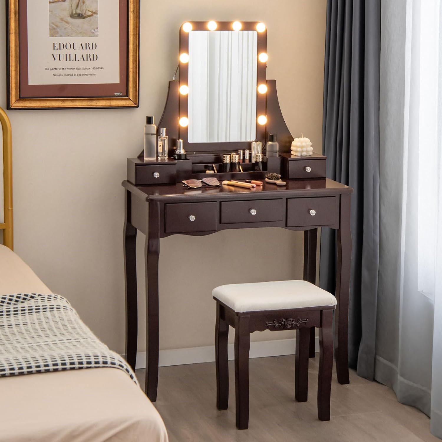 Description:This vanity table set will be a great gift for your mother, wife, daughter and friends! This vanity table comes with a rotatable LED lighted mirror, which features 3 color modes and adjustable brightness. And the control is easy with a touch switch. 5 drawers provide you with enough space to store and classify cosmetics, skincare products, jewelry and more. Built with solid wood legs, this vanity desk set is durable for years of use. For increased security, the package includes an anti-toppling device, which allows you to fix the table to the wall.Features:Can be switched in 3 color modes with adjustable brightnessEasy to control with sensitive touch switch5 drawers offer ample storage spaceCrafted with exquisite drawer knobsGives you the desired angle with rotatable mirrorIncludes a matched stool with thick and soft cushionDetachable top design provides more ways to use, such as a writing tableMade of high quality MDF and solid wood legsBuilt with rounded corners for anti-collisionAdds extra security with anti-toppling deviceSpecifications:Color: Black/Brown/WhiteMaterial: MDF, Pine Wood, Rubber WoodTable Dimension: 31.5"x 16"x 53.5" (L x W x H)Stool Dimension: 14"x10"x 18" (L x W x H)Weight Capacity of Tabletop: 88 lbsWeight Capacity of Stool: 176 lbsNet Weight: 37.5 lbsPackage includes:1 x Vanity Table1 x Stool1 x User Guide