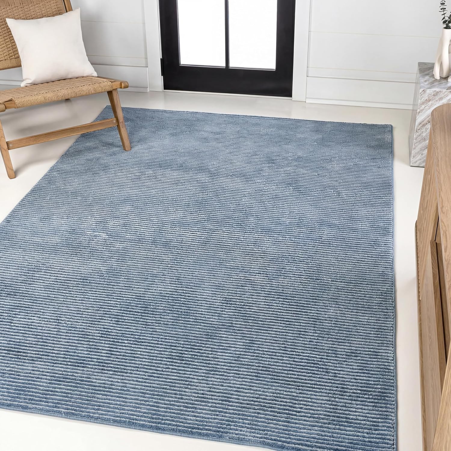 The low-key stripe pattern of this rug is the perfect backdrop for almost any traditional or farmhouse-inspired interior. The two-tone design has a modern, minimalist vibe that is woven from soft, durable yarn in a high-low pile that accentuates the pattern. Easy-care synthetic fibers make this rug a family-friendly choice too. Please note that variations in the rug's appearance may occur when the fibers are brushed due to natural light reflection and weaving characteristics.