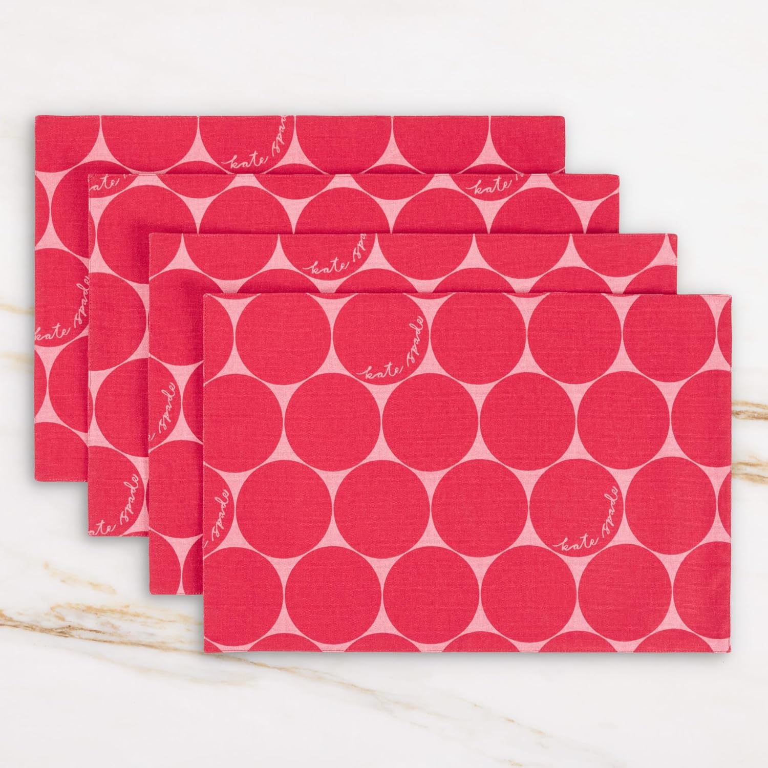 add a chic print to your dining table with the kate spade new york joy dot placemat 4-pack set. this placemat set features four placemats that will enliven your tablescape when entertaining. made of 100% cotton with a self-reverse, mod dot print, these colorful placemats will provide a stylish backdrop to your dining table place settings. coordinate these placemats with the in the loop & joy dot reversible table runner and joy dot napkins for a stunning tablescape. machine washable for effortless maintenance.
