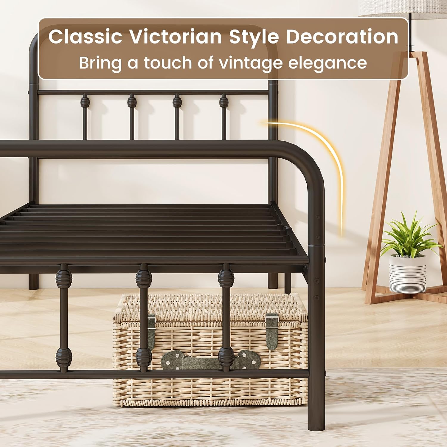 Description :Transform your space with our Victorian style metal platform bed - where timeless elegance meets modern durability. Featuring a stunningly crafted headboard and footboard with safety-first rounded corners, this bed frame is not just a piece of furniture, but a statement of style. Supporting up to an impressively weight, thanks to its ultra-strong frame and legs, with added non-slip foot pads for unbeatable stability. Sleep soundly on our noise-canceling, easy-to-assemble slat system, and enjoy the extra storage below - 12.5 inches of space to declutter and organize! Best part? No box spring needed and perfect for any standard mattress! Bring home the charm and sophistication of Victorian craftsmanship mixed with contemporary finesse. Elevate your bedroom instantly!Feature :Classic Victorian style decoration will bring a touch of vintage elegance12 robust metal slats with reinforced connection offers reliable supportHeavy-duty metal construction with support legs for longevity12.5" under bed storage space for suitcases, shoes and storage boxesNoise-free design ensures a restful night sleepEasy-to-assemble slats save you time and effortNo sliding mattress with anti-skid design of the bedNon-slip foot pads prevents unsightly scratchesSpecification:Color: BlackMaterial: MetalOverall Dimensions: 78" x 40" x 42" (L x W x H)Dimensions of Bed Platform: 75" x 39" (L x W)Clearance Between Bed and Ground: 12.5"Footboard Height: 26"Recommended Mattress: 8"-12" TwinWeight Capacity: 660 lbsNet Weight: 37.5 lbs1 x Metal Bed Frame1 x User Manual