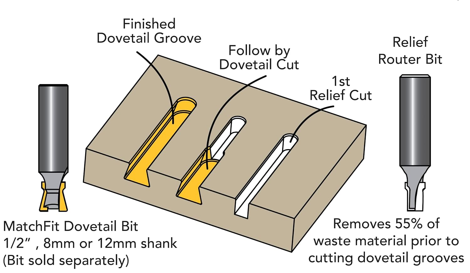 The Micro Jig MATCHFIT Relief Router Bit is specifically designed to remove 55% of waste material before routing dovetail grooves with the MATCHFIT Dovetail Router Bit. Starting with a relief groove improves the cut quality of dovetail grooves, and prolongs the lifespan of your MATCHFIT Dovetail Router Bit. Designed to be used with MATCHFIT Dovetail Router Bit. Features tear out-free 1/4 relief groove, 11/32" laser-cut depth guide router collet safety line and 1/16top radius, 3-degree up shear carbide. MATCH FIT Dovetail Router Bit is sold separately.