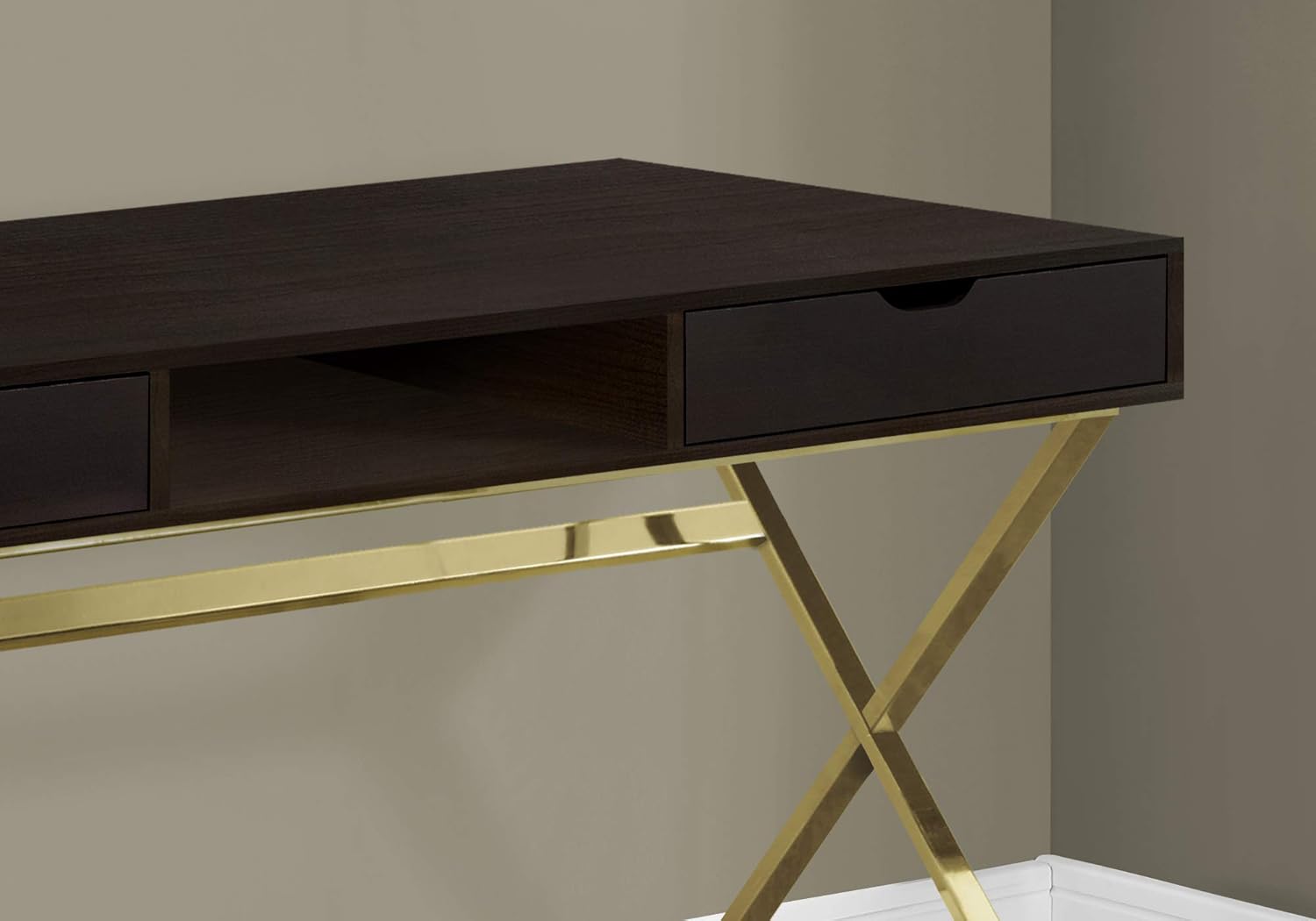 This modern Cappuccino desk is the ideal computer workstation for your home office. The stylish crisscross gold metal legs provide sturdy support while the Cappuccino top adds style. This practical yet fashionable desk offers ample surface room, 2 storage drawers with a cut-out handle and one open concept shelf perfect for storing away your laptop and other accessories.