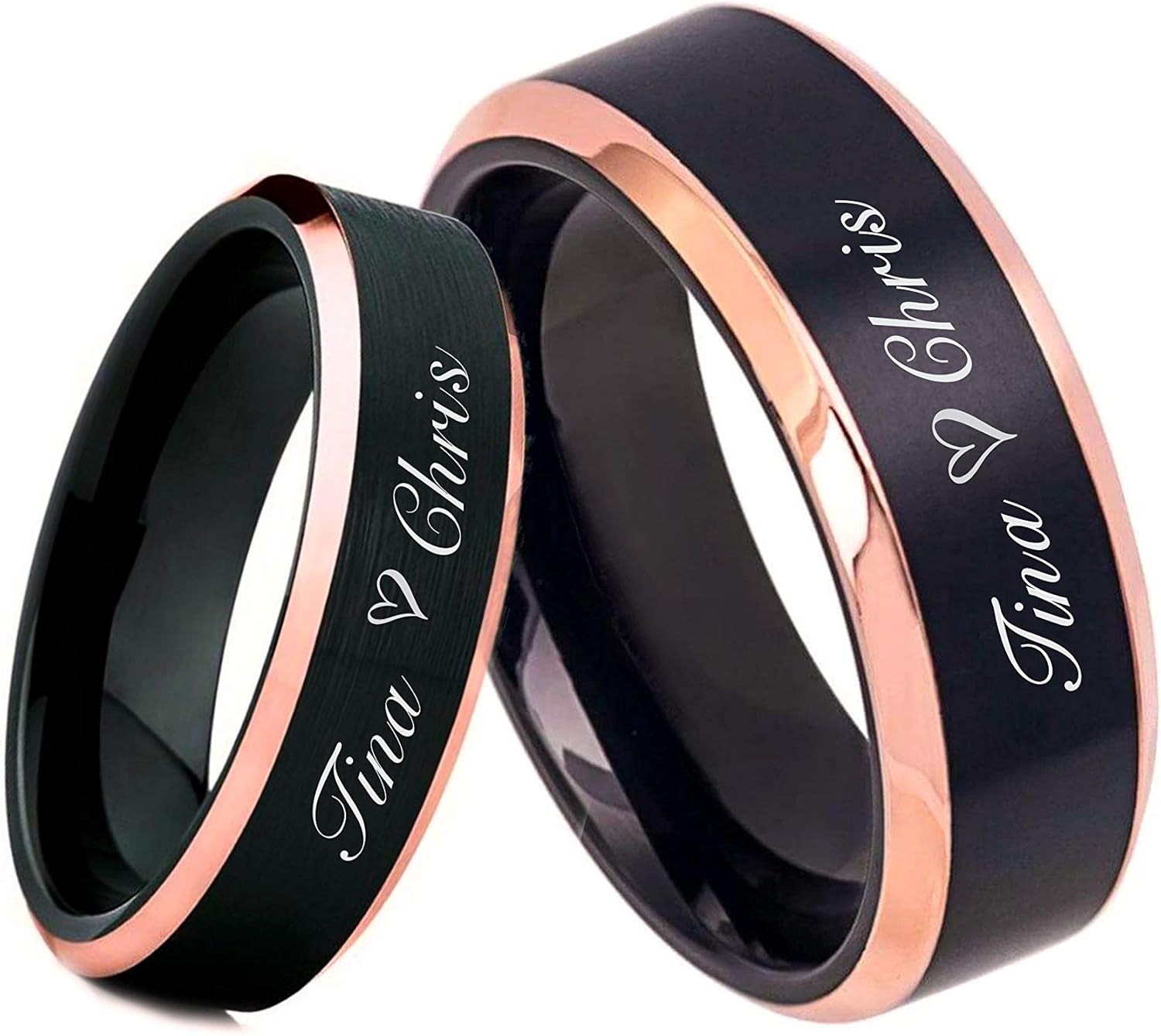 Celebrate your connection with our Personalized Rose Gold & Brushed Black Ring Set, designed for couples who want a modern, meaningful, and durable symbol of their relationship. This personalized black & rose gold ring set can be custom engraved on the inside and outside of the bands with any text or logo from our logo chart. With many different font styles and symbols to choose from this ring can be personalized just the way you like for that someone special. If you would like a logo, enter the number in parentheses in the text for engraving. Each ring features a striking two-tone design, blending a sleek brushed black finish with a polished rose gold band for a stylish, contemporary look. The rings are crafted from premium stainless steel, offering long-lasting durability, scratch resistance, and comfortable everyday wear. Each ring includes FREE custom engraving in ANY language — add names, special dates, initials, or a heartfelt message to create a personalized keepsake you’ll both treasure. Perfect as wedding bands, promise rings, or anniversary rings, this set delivers beauty, symbolism, and long-lasting quality. Our custom engraved stainless steel rings are fantastic at resisting fade, blemishes and rust. It is 100% resistant to corrosion. It will not fade, change color or leave stains on your body. It doesn’t require any maintenance to keep it looking new. Band Width: 5mm Sizes available: 4-4.5-5-5.5-6-6.5-7-7.5-8-8.5-9-9.5-10 Band Width: 7mm Sizes available: 6-6.5-7-7.5-8-8.5-9-9.5-10-10.5-11-11.5-12-12.5-13-13.5-14-14.5-15