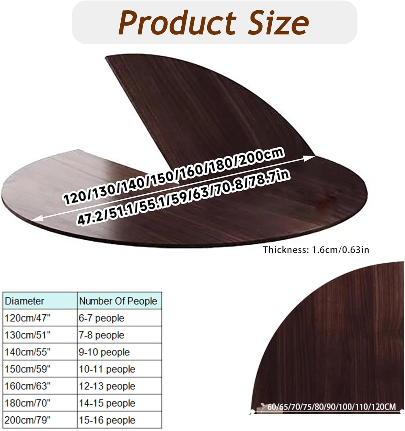Looking for a versatile solution to accommodate extra guests? Our Round Foldable Table Top is the perfect addition to your home, designed to temporarily extend your dining space for gatherings, parties, or holiday dinners. Crafted from solid wood plywood, this table top provides a sturdy surface that can support up to 110 lbs, making it ideal for everything from casual coffee chats to festive feasts.This innovative design features a quarter fold style, allowing for easy storage in closets, cabinets, or even under your bed. Its compact fan shape ensures it takes up minimal space when not in use, offering convenience for those who value practicality without sacrificing style.Available in three elegant colors—Brown, Natural, and White—this table top seamlessly blends with any décor, enhancing your living room or outdoor picnic setup. Whether you're hosting a small gathering or a larger event, our table top can accommodate various sizes: from 8-9 persons at 48 inches to 14-15 persons at 71 inches, ensuring there's plenty of room for everyone.Invest in a solution that combines functionality with aesthetic appeal. Our Round Foldable Table Top is not just a piece of furniture; it’s a tool that brings friends and family together, making every meal a memorable occasion.Specifications:- Name: Round Foldable Table Top- Material: Solid Wood Plywood- Style: Quarter Fold- Colors: Brown, Natural, White- Weight Capacity: 50kg/110lbs- Thickness: 1.6cm/0.6in- Diameter and Capacity: 120cm / 48in: 8-9 persons 130cm / 51in: 9-10 persons 140cm / 55in: 10-11 persons 150cm / 59in: 11-12 persons 160cm / 63in: 12-13 persons 180cm / 71in: 14-15 persons- Packing: Folding table × 1 (without legs)