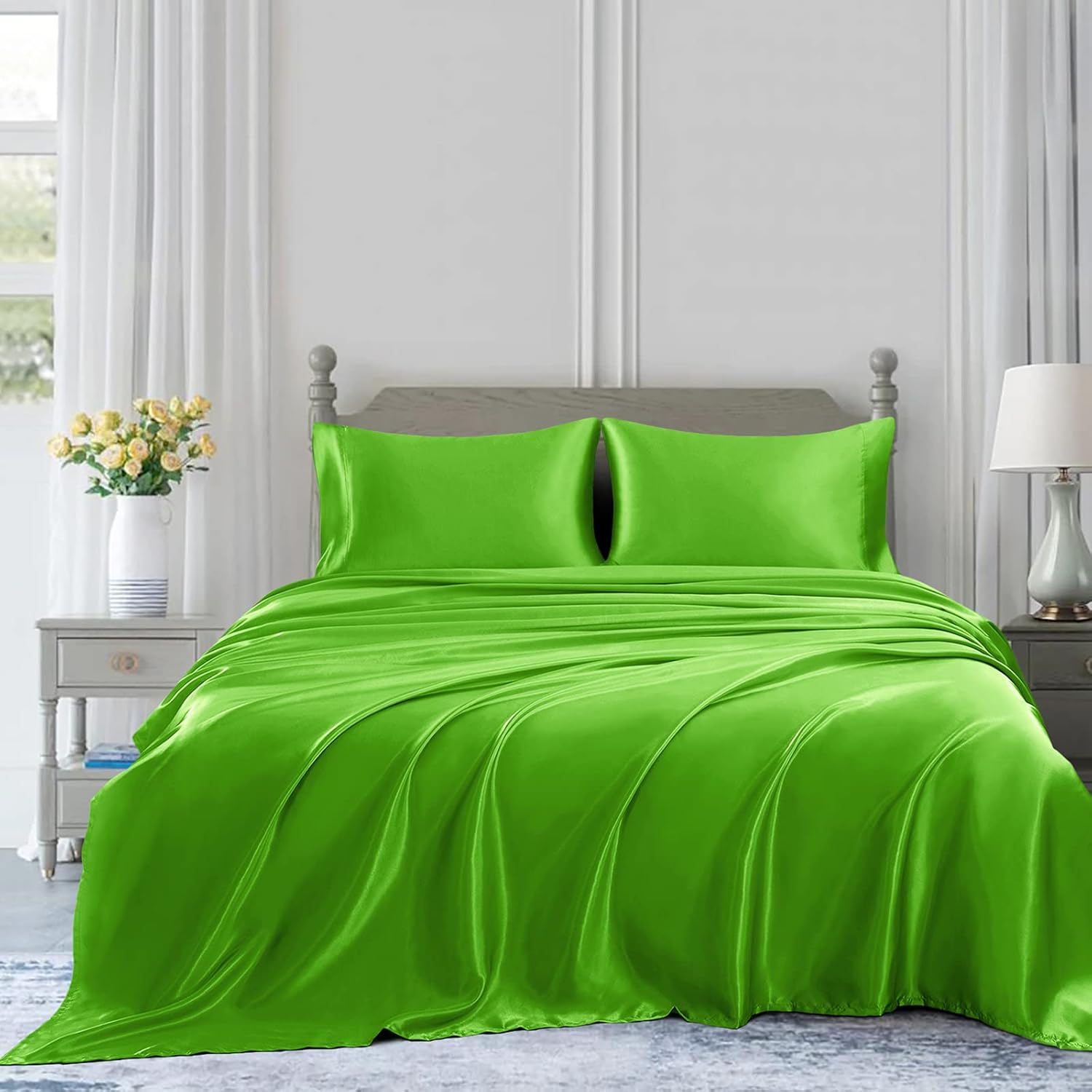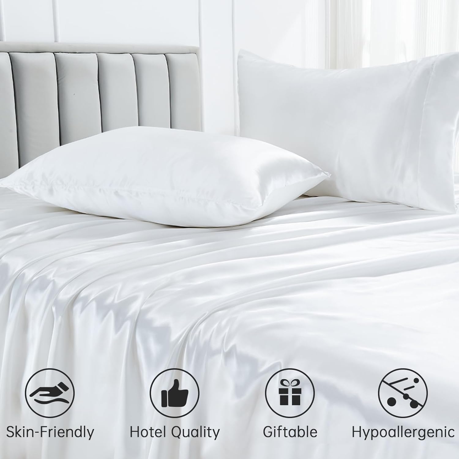 Indulge in the luxurious softness of PRSkinsheets 22 Momme Mulberry Silk Bed Sheets. This Sheets Set includes 4 pieces of premium bedding designed to provide unparalleled comfort and style. Crafted from the finest mulberry silk, these sheets are incredibly smooth and gentle on your skin, ensuring a peaceful night's sleep. The colors exudes elegance and sophistication, complementing any bedroom decor. With a deep pocket depth of 14-18 inches, these sheets fit snugly on your mattress, staying in place throughout the night. Experience the ultimate in luxury and treat yourself to the PRSkinsheets Mulberry Silk Bed Sheets set.