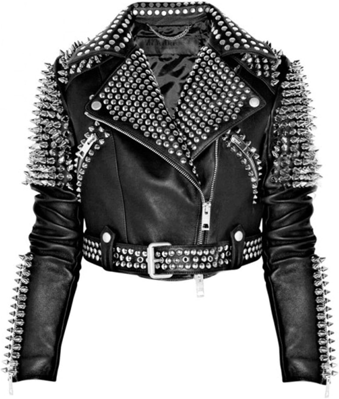 Women's Studded Biker Leather Jacket - Brando Style Vintage Motorcycle Jacket with Spikes, Belted Waist - 5 Design OptionsMake a bold statement with this Women's Punk Studded Biker Leather Jacket, inspired by Britney's iconic Brando style. Designed for fearless fashion lovers, this vintage motorcycle jacket is covered in high-quality silver or golden spikes, available in 5 unique styles to match your vibe.Crafted from premium leather with a soft polyester inner lining, this jacket offers both comfort and edge. It features a classic lapel collar, zipper cuffs, belted waist, and durable YKK front zipper closure - combining attitude with practicality.With 2 waist pockets and 1 inner pocket, this jacket is not just stylish, but functional too. Perfect for parties, concerts, cosplay, Halloween, or everyday wear, this studded leather jacket brings the perfect mix of punk rock energy and vintage fashion to your wardrobe.Dare to stand out - your ultimate biker jacket has arrived.Caring Tips:To maintain the quality and longevity of your leather jacket, gently wipe it with a soft cloth for daily cleaning. For occasional deep cleaning, we recommend soft dry cleaning only. Do not machine wash, bleach, or tumble dry, as these may damage the leather and hardware.
