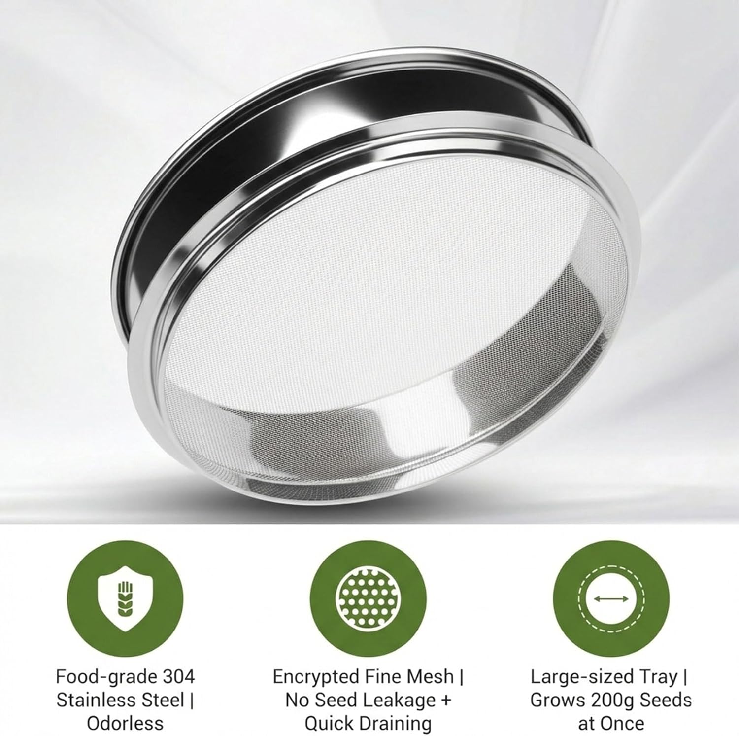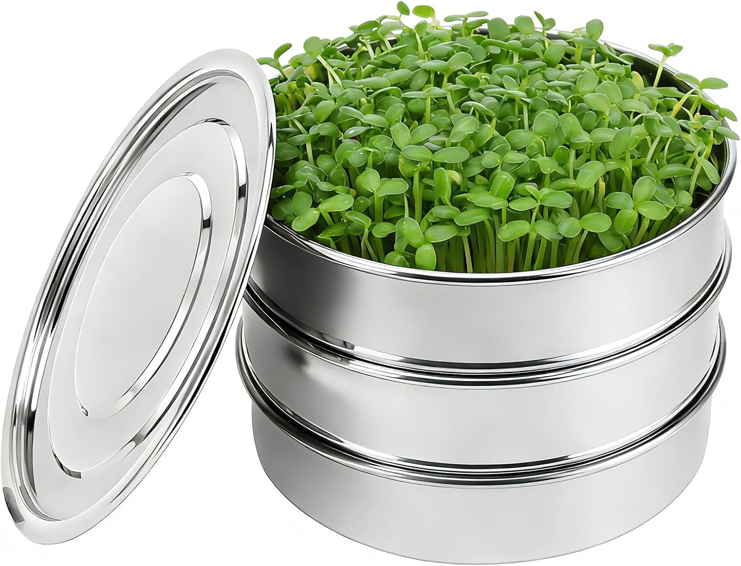 Stainless Steel Sprouting KitAbout This ProductOur stainless steel sprouting kit is crafted from durable, rust-resistant materials and features a stackable design that saves valuable counter or windowsill space. The set includes a fine-mesh draining base, two trays, and a cover. The precise mesh allows for drainage while keeping seeds securely in place.Easy to use—just soak, rinse, drain, and follow the included guide. Packaged in an elegant gift box, it makes a thoughtful and healthy present for family and friends, bringing the joy of fresh greens into everyday life.SpecificationsKit Size: 7.9-inch with 2 Mesh Trays + 1 Lid + 1 BaseMaterial: Stainless SteelDimensions: 9.1" x 9.1" x 7.9"Package Includes2 Mesh Trays1 Lid1 Base