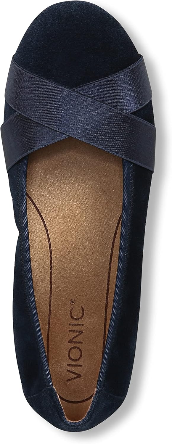 Dance your way across town or just across the office in ballet flats made to move with you whereever you go. Way more stylish than sneakers, these fabulous suede flats carpet you in comfort while keeping you feeling polished and poised for the day. For the greatest comfort, we recommend wearing your new Vionic footwear for just a few hours for the first few days to allow your feet to adjust to the new level of orthotic comfort and support. Within one to two weeks you should find the product completely comfortable and supportive. To preserve the appearance of your Vionic shoes, we recommend that you clean, if needed, using a dry, cotton cloth to wipe away dirt or dust. Keep footwear away from direct heat to prevent from drying out. If your shoes become wet, please allow them to dry naturally. We recommend that you test any cleaning product by applying a small amount to a discreet area and allowing it to dry. Do not use cleaners which contain acid or detergents, as they may damage and prematurely age the leather. Received APMA Seal of Acceptance. Vionic shoes provide essential stability and addictive support. With contours seamlessly engineered into each and every pair–from flip flops to heels–Vionic helps support natural alignment from the ground up, in looks you’re going to love.