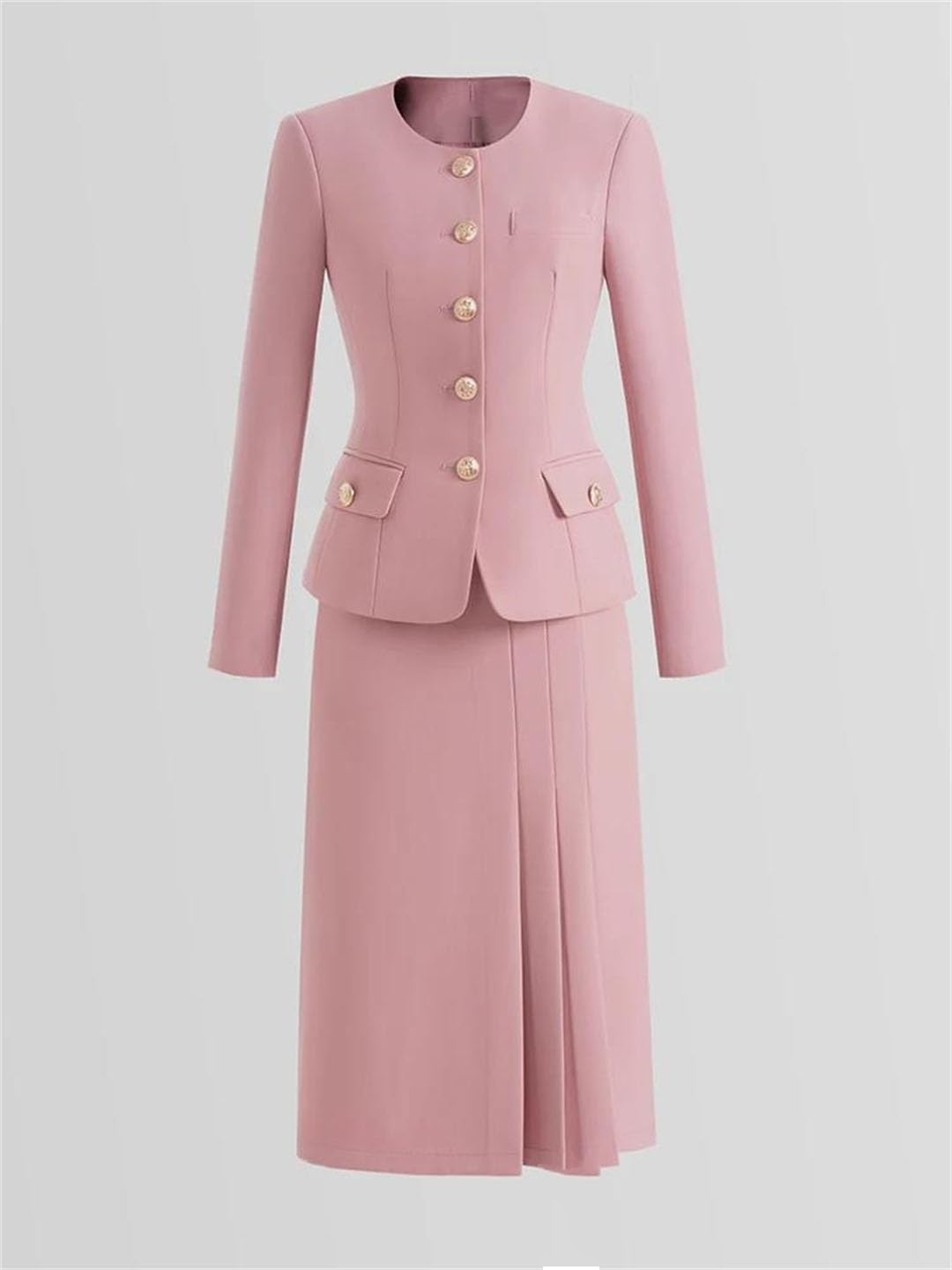 Material: Polyester, SpandexNeckline: Round NeckClosure Type: Single-BreastedFully Open: NoSleeve Type: Shirt SleevesSilhouette: Slim FitSeason: Autumn/WinterPattern Type: Solid ColorFabric Type: Synthetic FiberFabric Composition: 96% And AboveClothing Fit: Slim FitMaterial Composition: Polyester; SpandexSkirt Length: Knee-LengthSleeve Length (Cm): Long SleeveDecoration: ButtonsGender: FemaleProduct Type: Skirt SuitFit: Slim Fit