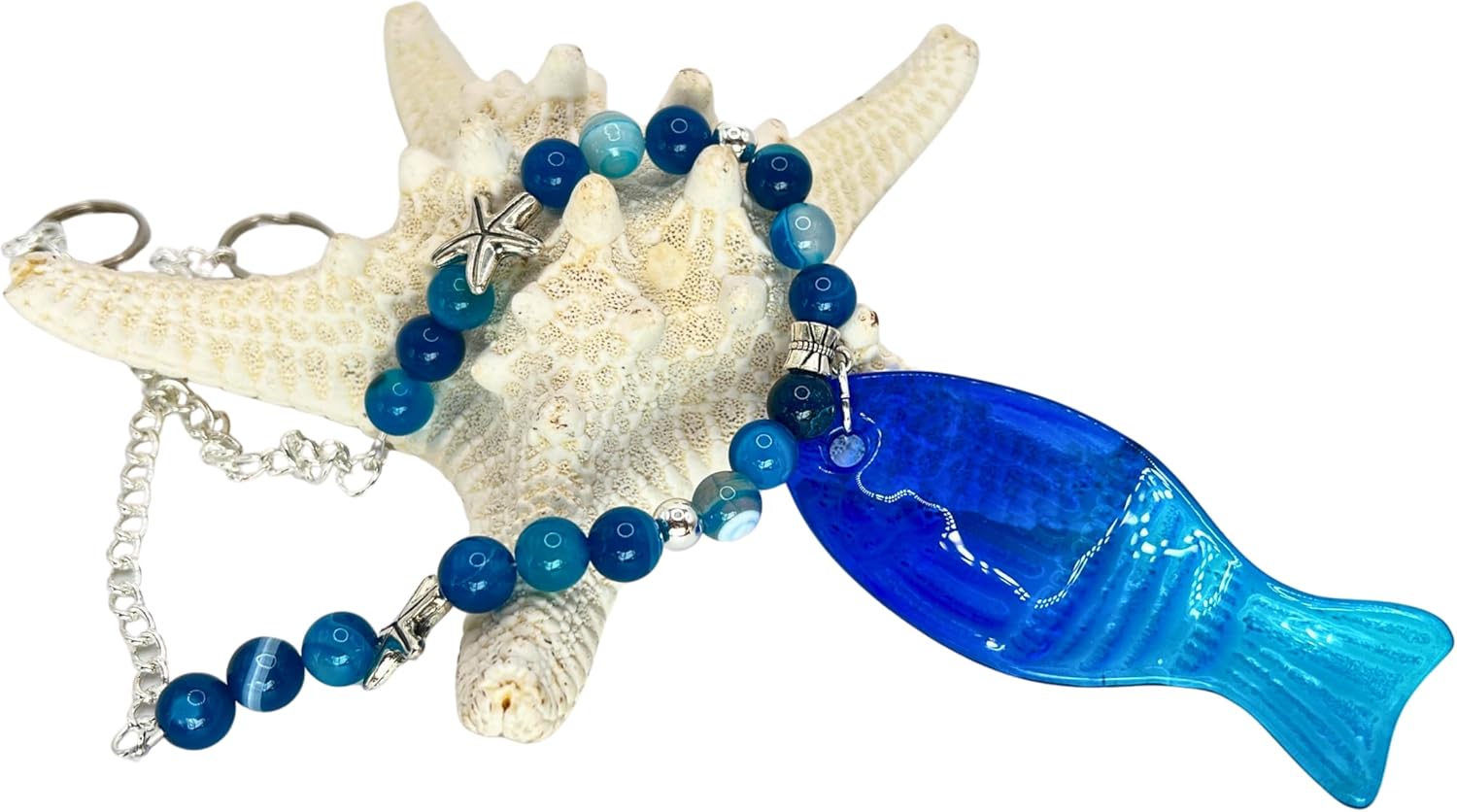 Transform your living space with these exquisite nautical-themed curtain tie backs. Each set features stunning blue ombre glass fish pendants that capture the essence of ocean waves, perfectly complemented by a string of coordinating blue agate beads and decorative silver starfish accents. The beaded strand includes various shades of blue, from deep navy to light aqua, creating a beautiful gradient effect that mirrors the fish pendants. The silver-toned chain and findings add an elegant touch, while the multiple attachment rings provide flexible hanging options. These statement pieces do more than just hold back your curtains - they bring a sophisticated coastal charm to any room. Perfect for beach houses, coastal-themed decor, or anyone wanting to add a touch of maritime elegance to their window treatments. The substantial size of the fish pendants (as shown with penny for scale) makes them eye-catching focal points that will draw admiring glances. NAUTICAL DESIGN: Beautiful ocean-inspired curtain tie backs featuring hand-painted blue ombre glass fish pendants and decorative starfish accents MEASUREMENTS: Each fish pendant measures approximately 2.5 inches long, with an 8-inch beaded section perfect for most curtain arrangements