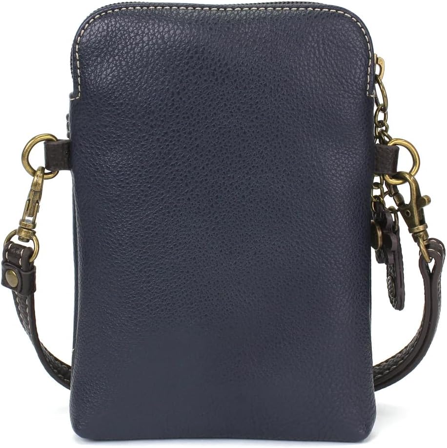 Small front pocket adorned with Horse B Chala Pal Adjustable strap - turn bag into a purse, a crossbody bag, or even a pouch! Top zipper closure Decorative zipper pull Extra padding throughout bag to protect your cell phone 3 credit card slots inside 2 Adjustable straps that are detachable Materials: Faux Leather Color: Navy Approx. Measurements: 5"W x 7.5"H x 1"D Strap adjustable: 7"-31" Designed in California, USA