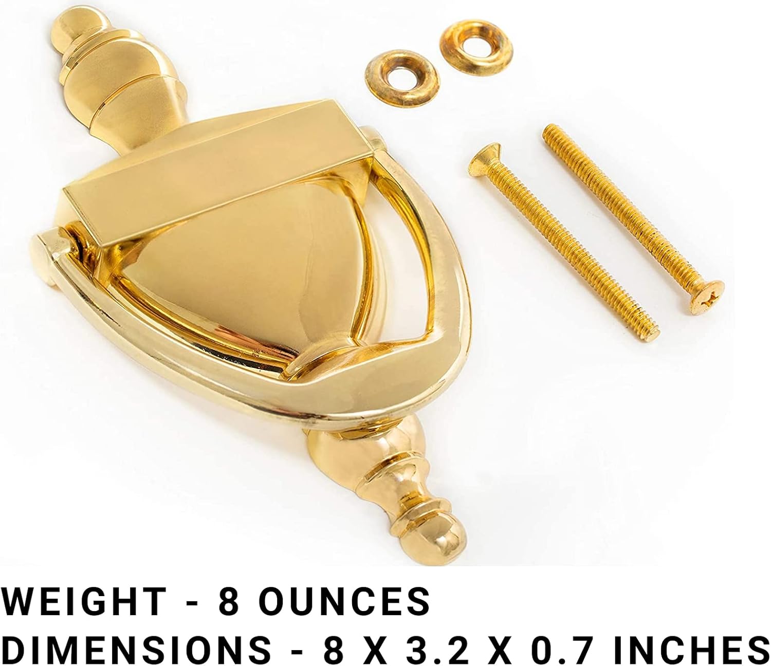 Everbilt Classic Bright Brass Finish Door Knocker Size 6-5 / 16 Everbilt Classic Bright Brass Finish Door Knocker is Stylish and convenient, this door knocker is a sophisticated way for visitors to announce their arrival. Mounting hardware included. Available in a variety of finishes. A Door Knocker is an ideal decorative accent for a front door and is a great alternative to a doorbell for announcing a visitor. They are durable and appealing to the eye, as well as functional. Door Knocker can be engraved to personalize your home.FeaturesColor - Bright BrassMaterial - MetalWeight - 4 ounces Dimensions - 8 x 3.2 x 0.7 inchesSpecifications✔ Made of High quality Metal with Bright brass finish.✔ Mounting hardware is included.✔ Surface mounting (won't show on interior of door).✔ Unique design adds a sophisticated look to your door.Box ContainsEverbilt Classic Bright Brass Finish Door Knocker Size 6-5 / 16