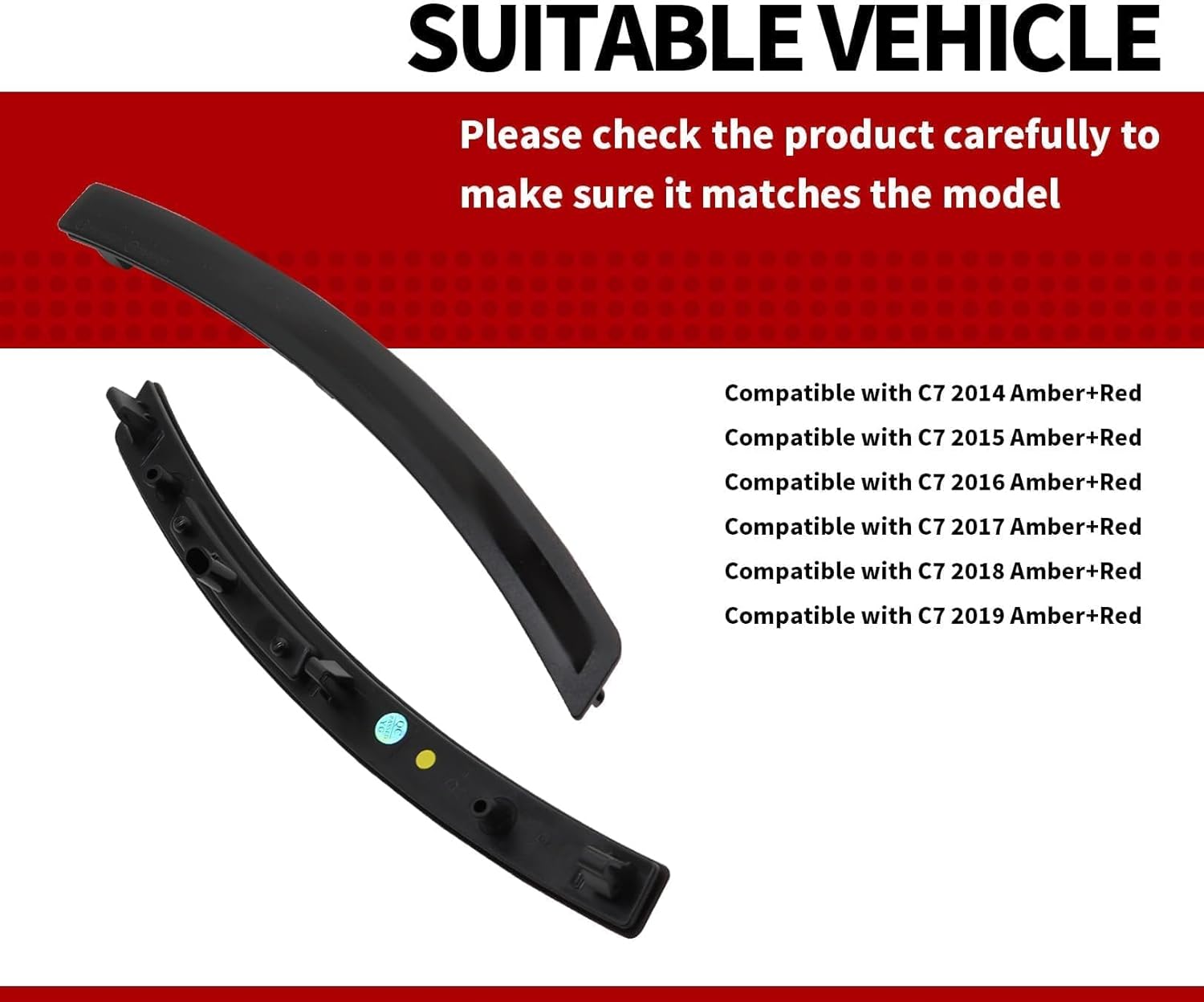 Fitment:Front & Rear Side Marker Lights Compatible with Corvette C7 2014 2015 2016 2017 2018 2019 Amber+RedSmoke Lens side marker lamps Compatible with 2014 Corvette StingraySmoke Lens side marker lamps Compatible with 2015 Corvette Stingray, Z06Smoke Lens side marker lamps Compatible with 2016 Corvette Stingray, Z06Smoke Lens side marker lamps Compatible with 2017 Corvette Grand Sport, Stingray, Z06Smoke Lens side marker lamps Compatible with 2018 Corvette Grand Sport, Stingray, Z06Smoke Lens side marker lamps Compatible with 2019 Corvette Grand Sport, Stingray, Z06, ZR1Replaces Part Number:22771196227711972321092923210930Packing List:2 x Driver side marker lights2 x Passenger side marker lightsDescription:Placement on Vehicle: Front, Rear, Left, RightItem Name: Side marker lightsColor: Amber, redLen color: SmokeVoltage: 12V