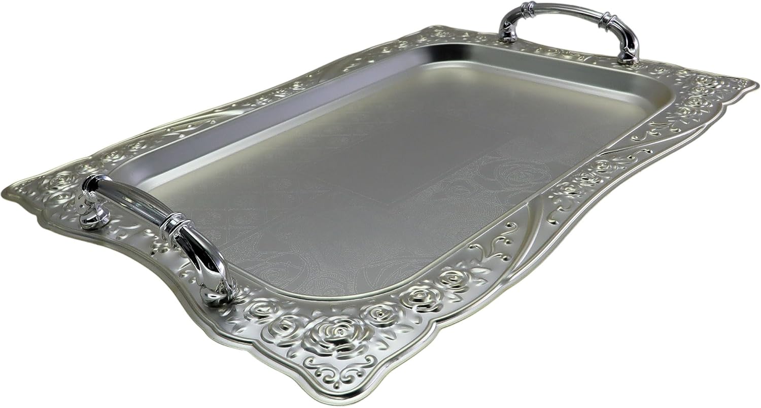 Maro Megastore Serving Trays are perfect for displaying red wines, cakes, bread, cheese, vegetable creations, and other appetizer-sized foods. Our extensive variety of serving trays and display platters adds a visually pleasing appeal to your foods, wines, candles, and other items. We offer a wide selection of serving and display platters/trays at affordable prices, adding value, style, and elegance to your party, restaurant, or catering services without breaking your budget! Feel free to browse our collection of high-quality serving and display ware, featuring decorative serving trays, plates, bowls, dishes, and platters. We provide various materials and finishes, including: Stainless Steel: Silver, Satin, Mirror finish Iron: Gold, Silver, Antique Gold, Metallic Bronze, Pewter, Nickel, Chrome