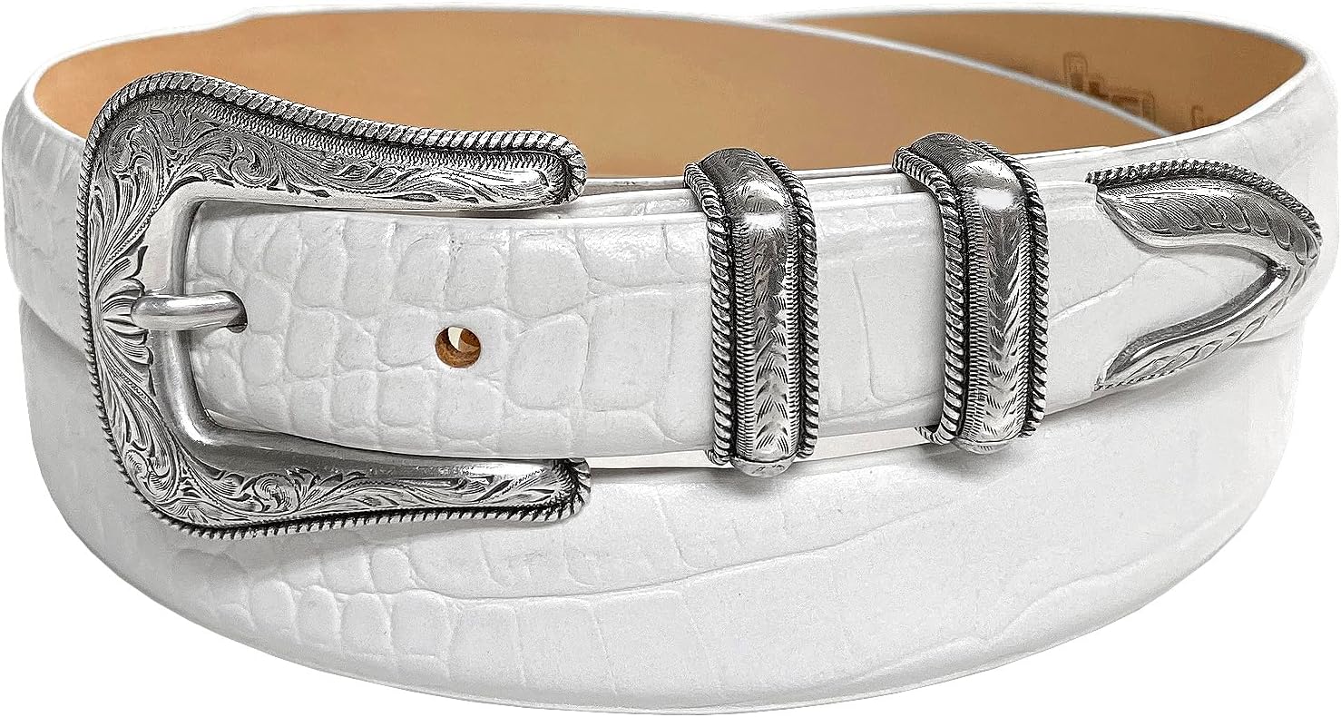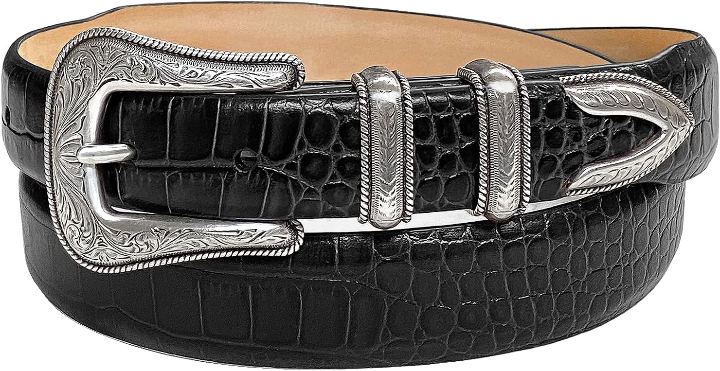 Made from High-quality Genuine Full-Grain Cowhide Leather, Hand-polished Silver plated four-piece buckle set belt. 1-1/8"(30mm) taper down to 1"(25mm) wide belt with 5 belt holes for plenty of room for adjustments to offer maximum comfort. A great designer dress belt perfect for work, business, sport, and outdoor. Detailed of Alligator, Lizard embossing, or smooth leather belt. ★★★ How to measure your Belt size ★★★: The best way is to measure around where you wear the belt and add 2 inches to the measurement. Our belts are measured from the fold where the buckle is attached to the middle hole. If you want to get the best size we recommend measuring a belt that works for you from the fold to the hole where you wear the belt.