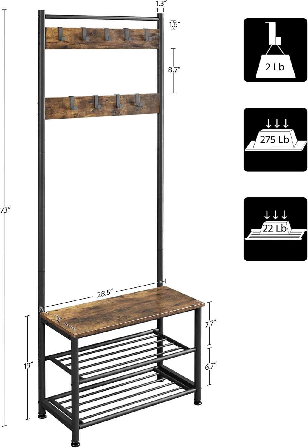 73” H Metal Hall Tree with Shoe Storage Bench Entryway Coat Rack with 2 Shoe Shelves & 9 Movable Hooks Entryway Hall Foyer Mud Room Bed RoomQuick overview:Bring order to your mudroom or foyer with this industrial farmhouse style hall tree. Constructed of baking finished metal and CARB P2-compliant manufactured wood, the hall tree has a good performance on strength, durability, and rust resistance. The 3-in-1 multifunctional hall tree provides you with 9 movable hooks, 2 additional open shelves, and 1 shoe changing bench that can hold up to 125kg/275lb. A practical addition to the entryway, hall, foyer, mudroom and bedroom.Specifications:Color: rustic brown board, black frameHook Qty.: 9Material: baking finished iron, manufactured woodOverall dimension: 28.5x13x73” (LxWxH)Distance between shelves: 6.7”Bench size: 28.5x13” (LxW)Bench height: 19”Main framework tube diameter: 1.3”Load capacity: bench: 275lb; each shelf: 22lb; each hook: 2lbG.W.: 26.9lbPackage included:1 x Hall Tree1 x Assembly Instructions1 x Accessory Kit2 x Anti-tip Kit