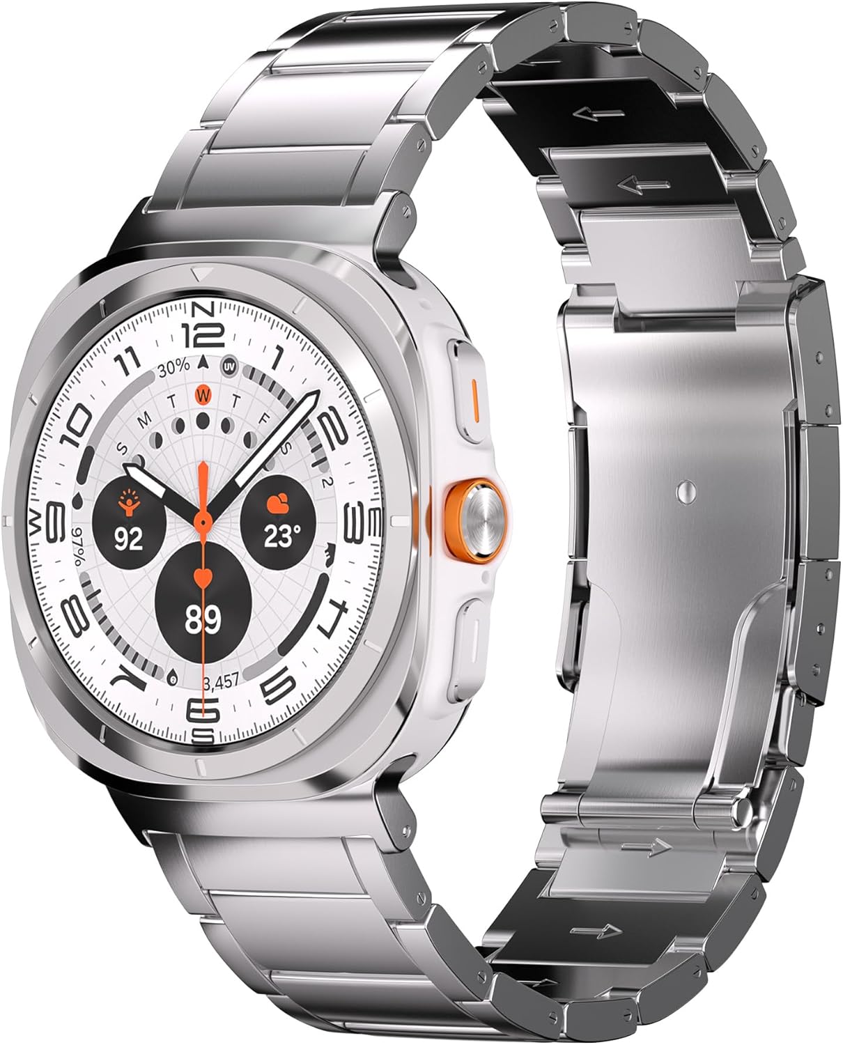 Transform your Samsung Galaxy Watch Ultra 47mm with the Ultra Supply Co. Titanium Band, carefully crafted for strength and long-lasting use. Made from Grade 2 Titanium, this band offers impressive durability without adding extra weight, allowing you to wear your smartwatch all day without discomfort. The lightweight, tough material ensures it lasts, making it ideal for both everyday wear and outdoor activities. Designed with a scratch-proof DLC (Diamond-Like Carbon) coating, this band retains its sleek look even after years of use, offering enhanced protection against daily wear. Whether you're at work, exercising, or enjoying outdoor activities, the band’s waterproof feature ensures it can withstand rain, sweat, or even swimming. For a custom fit, the band features an adjustable design with a folding buckle, allowing it to be resized to fit wrists of all sizes. With included tools and easy-to-follow instructions, adjusting the band to your exact specifications is simple. The foldable buckle ensures your smartwatch stays securely in place throughout the day. Seamlessly matching the sleek design of the Samsung Galaxy Watch Ultra, this band complements your device’s appearance while offering great functionality. Whether you're dressing up your smartwatch for a formal occasion or need a rugged band for an active lifestyle, the Ultra Supply Co. Titanium Band is the ideal solution. With this band, you get excellent quality and a timeless, stylish look that suits any occasion. Elevate your smartwatch experience with the Ultra Supply Co. Titanium Band for Samsung Galaxy Watch Ultra 47mm.